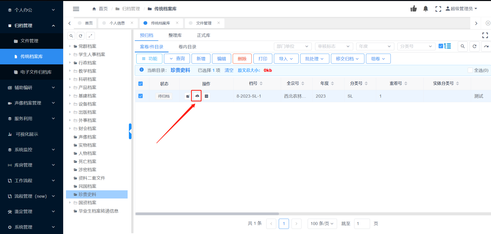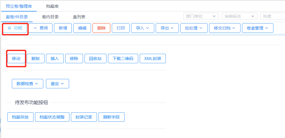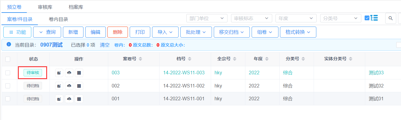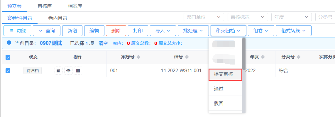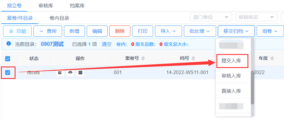 将预立卷/整理库下的档案整理完成后,将档案数据进行提交审核入库操作