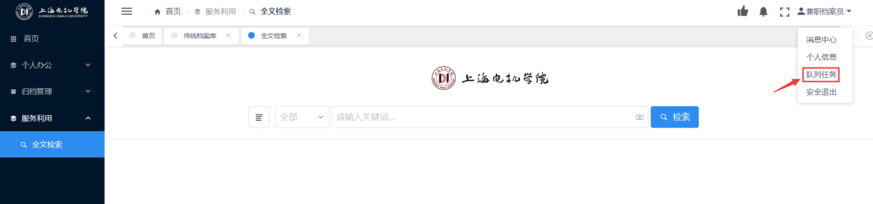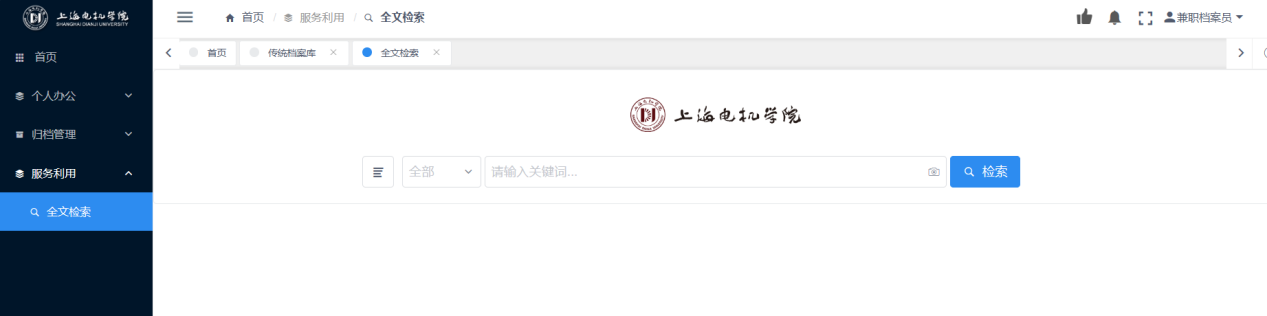 全文检索主要是针对档案库中成型档案的搜索查询,全文检索是一种模糊查询可以根据关键词做对应查询检索,点击导航栏上的【利用中心】-【全文检索】按钮即可打开全文检索界面,如下图: