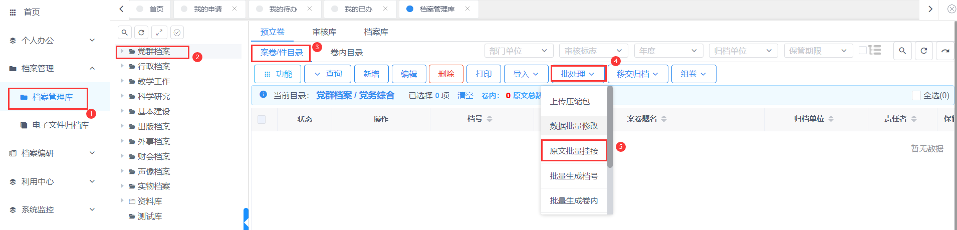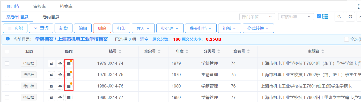 针对已经数字化的纸质档案可以通过命名规则做原文的批量挂接。挂接分为案卷目录挂接和卷内目录挂接,分别在案卷目录页签下和在卷内目录下点击【批处理】-【原文批量挂接】。