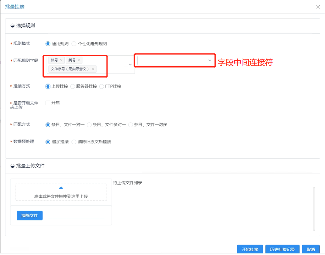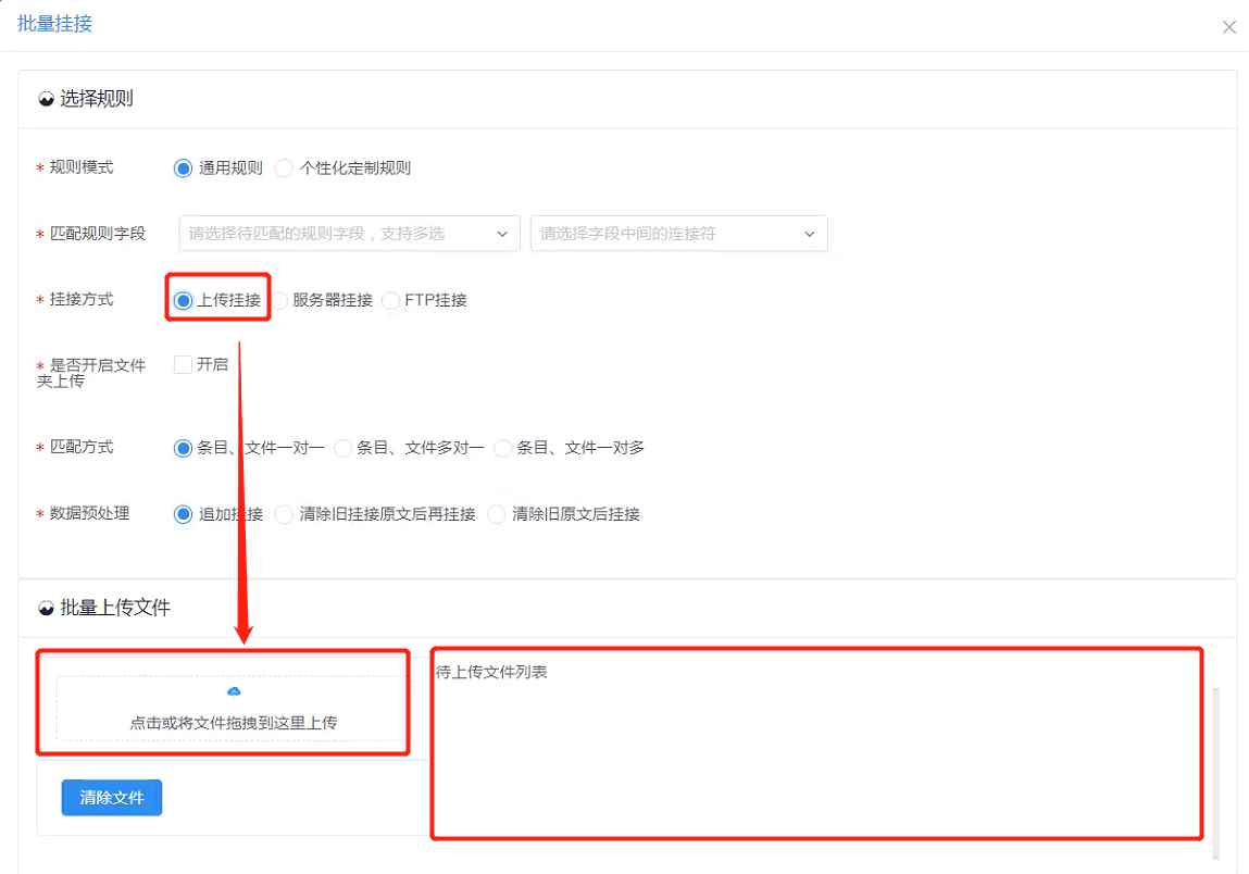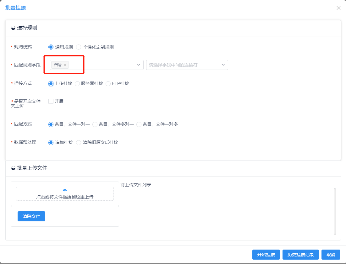 当匹配方式为一对一时,匹配规则字段与待上传文件名一一对应;当选择条目、文件多对一时,多个条目(匹配规则字段)对应一个文件;当选择条目、文件一对多时,多个文件对应一个条目(匹配规则字段)。