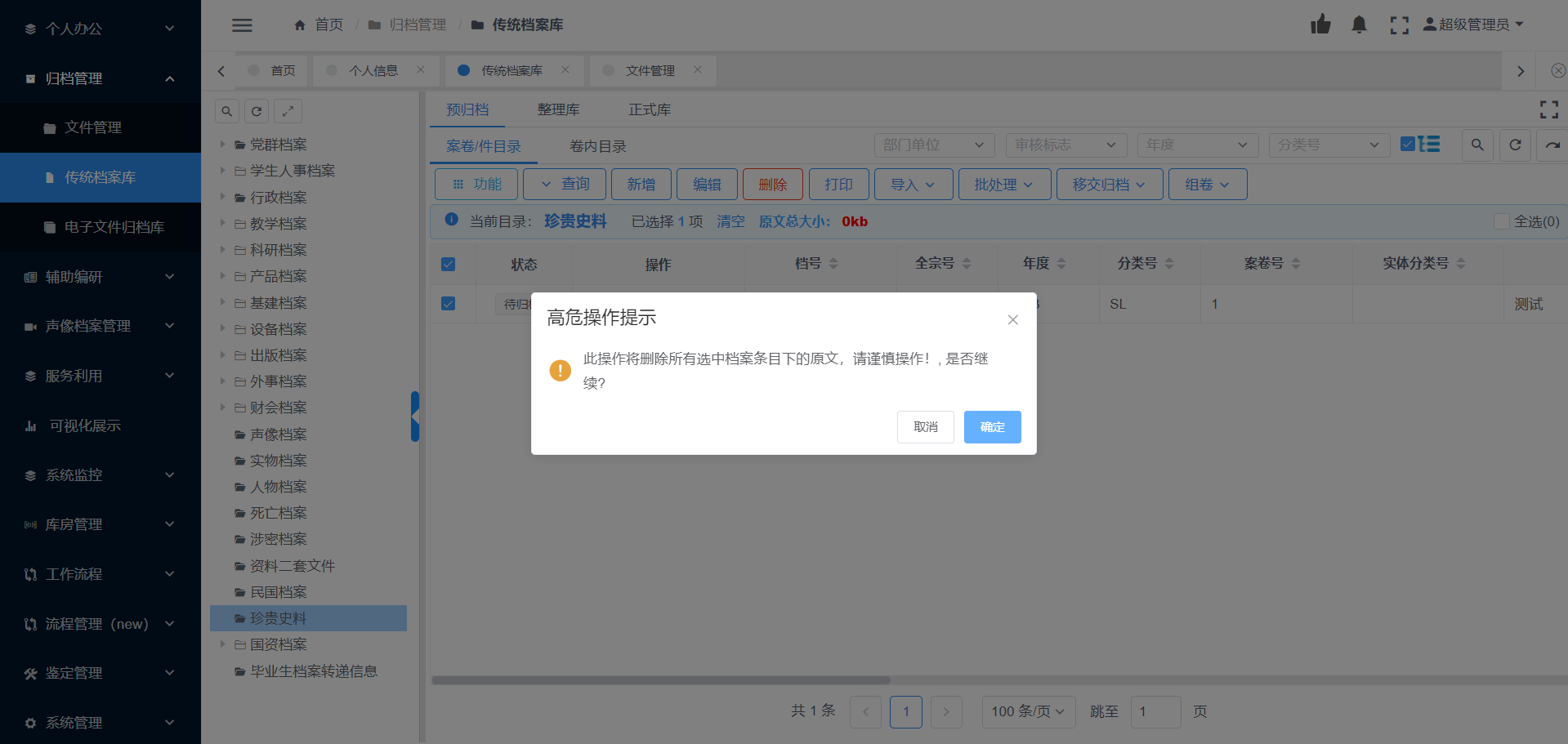 此功能用于删除指定的档案条目,选择要删除的案卷,点击【删除】按钮,即可弹出删除对话框,点击【确定】按钮,即实现案卷删除操作,见图11-47。