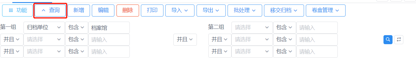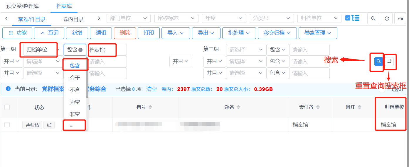 例如:筛选出【归档单位】为【档案馆】(或包含【档案馆】)的档案条目数据,点击第一组中的选择项下拉选中【归档单位】,条件关系选择【包含】或【=】(【包含】即数据中包含此输入项,【=】即数据等于此输入项),右侧输入项填写【档案馆】,完成后点击右侧的【搜索】按钮进行查看。若有多个条件,可在第二行选择【并且】或者【或者】,【并且】表示多个条件同时满足可查询到,【或者】表示两个条件满足一个即可查询到。