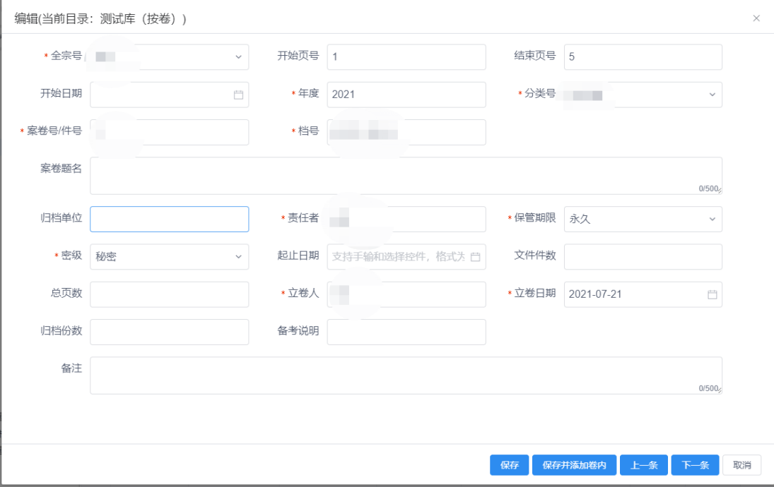 此功能用于修改指定的卷内条目,(在对应案卷的卷内目录下或卷内目录下)选择要修改的卷内条目,点击【编辑】按钮即可弹出编辑界面,完善其相关信息后点击保存即实现卷内条目修改操作,见图11-45、图11-46。