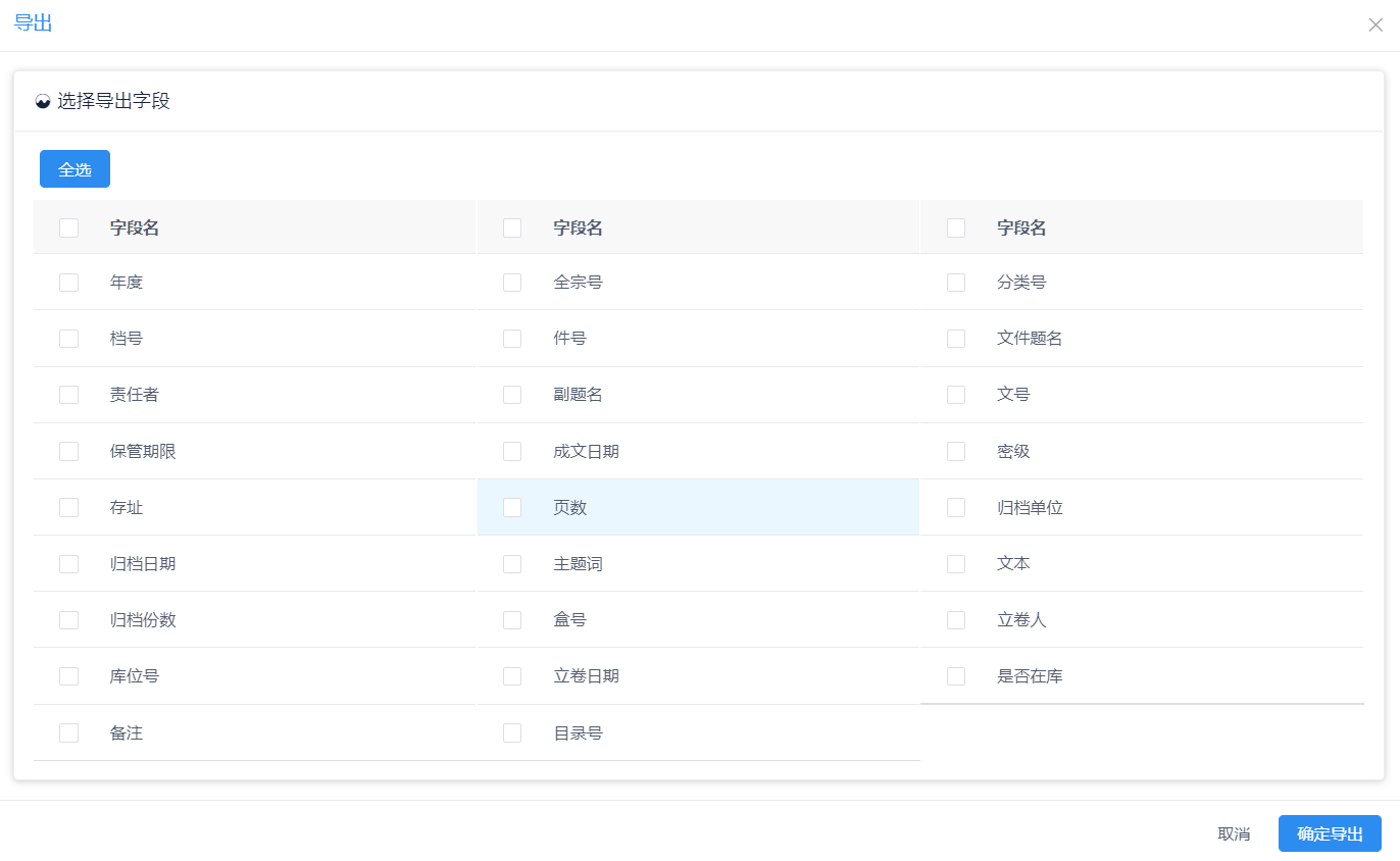 若系统中的数据需要导出为excel时,先筛选并勾选需要导出的部分档案数据,再点击功能中的“导出”-“导出条目”进行导出,案卷和卷内档案条目需要分开导出,案卷档案条目在案卷目录下导出,卷内档案条目在卷内目录下导出,选择需要导出的字段,点击确定导出按钮,即可导出勾选的档案数据,文件格式为XLSX格式,见图11-98、图11-99。