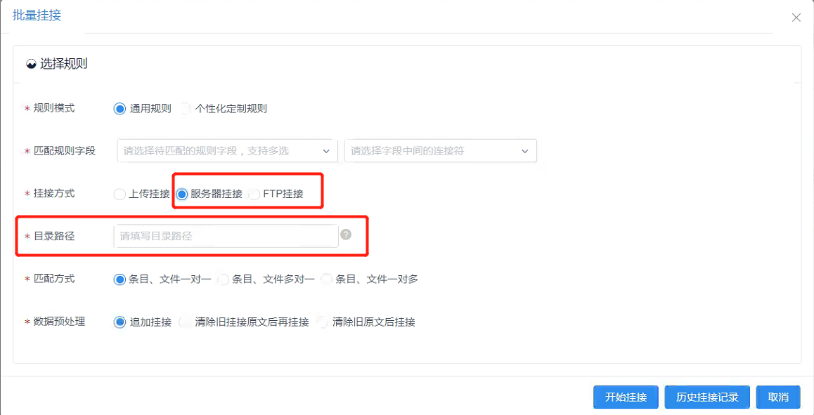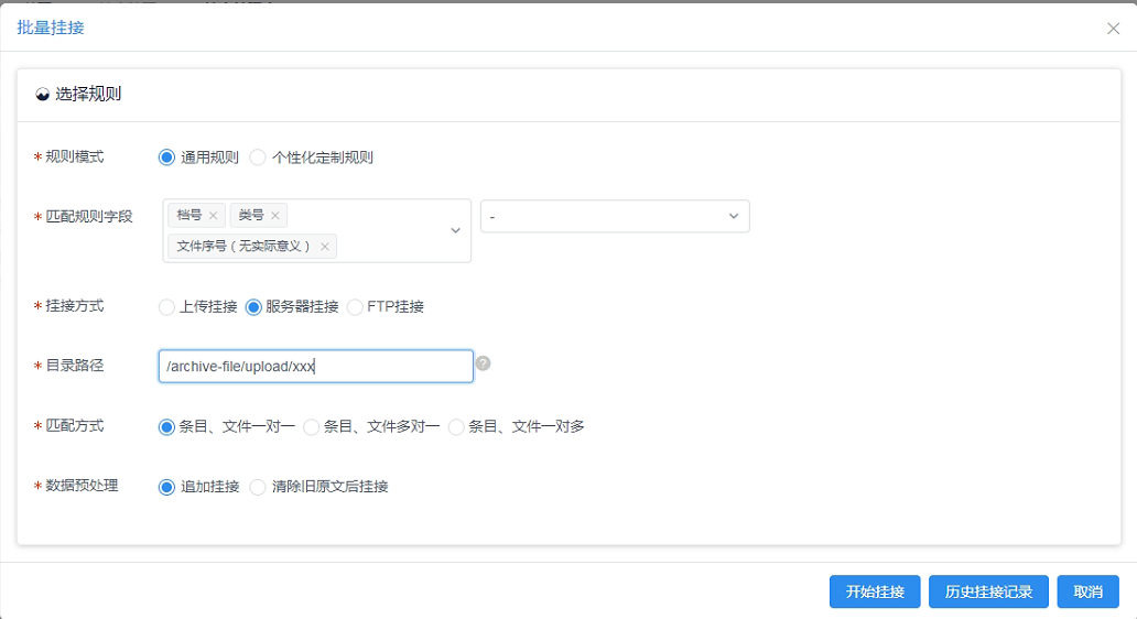 当挂接方式选择【服务器挂接】或【FTP挂接】时,需要填写目标路径,见图11-72,例如:/archive-file/upload/xxxxx。