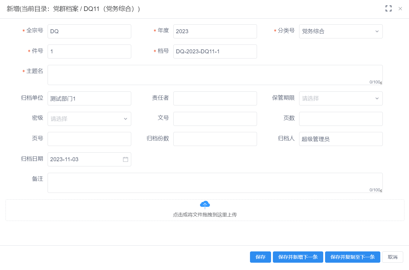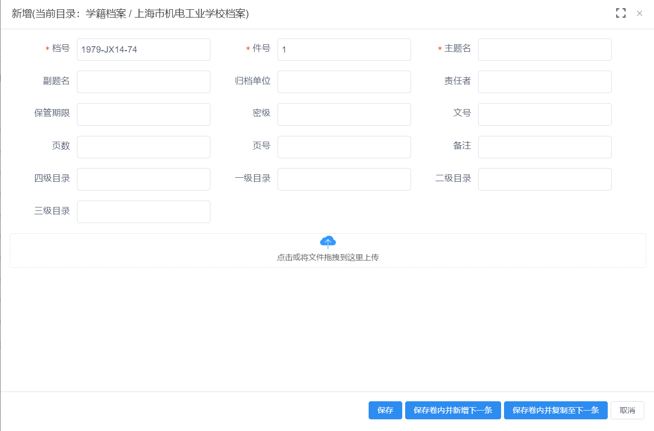 【保存卷内并新增下一条】按钮功能即保存此条卷内后打开新增一条卷内数据。