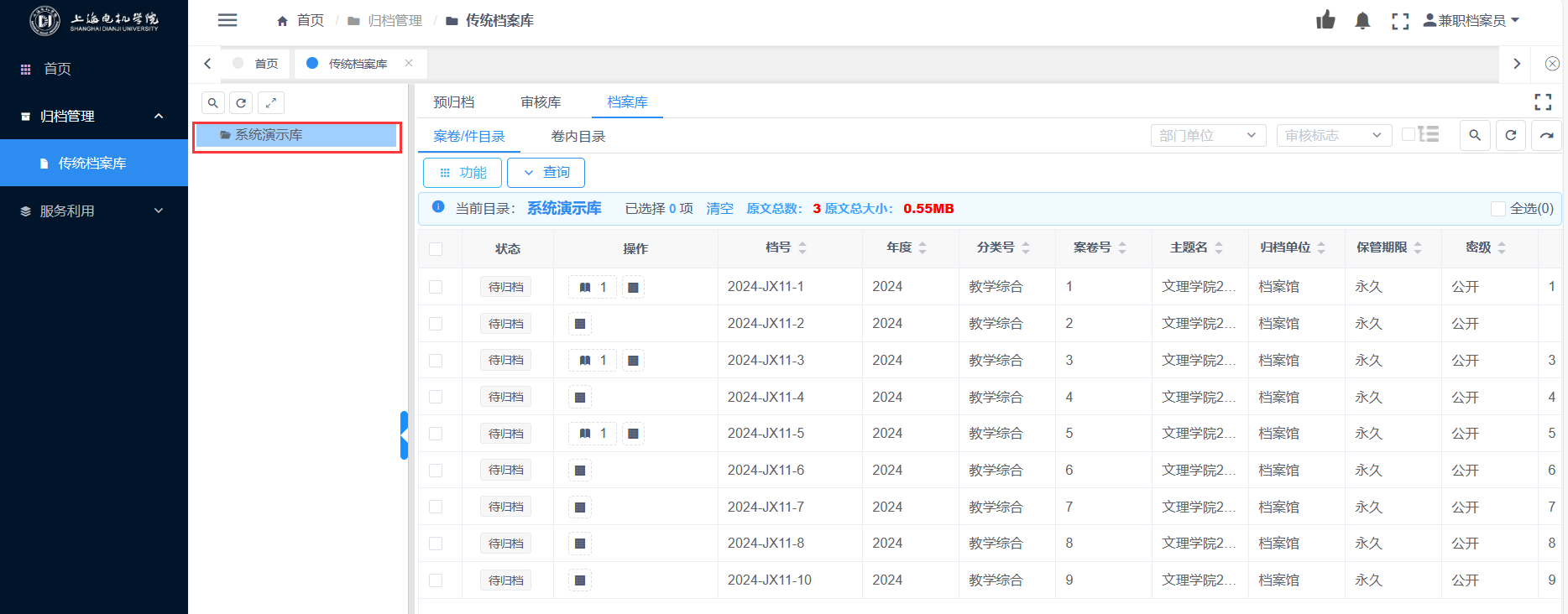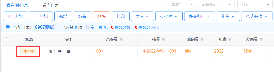 勾选状态为待归档的档案条目,点击“移交归档”-“提交入库”按钮,打开提交入库审核页面,点击提交按钮,此时档案条目的状态为待入库。如下图: