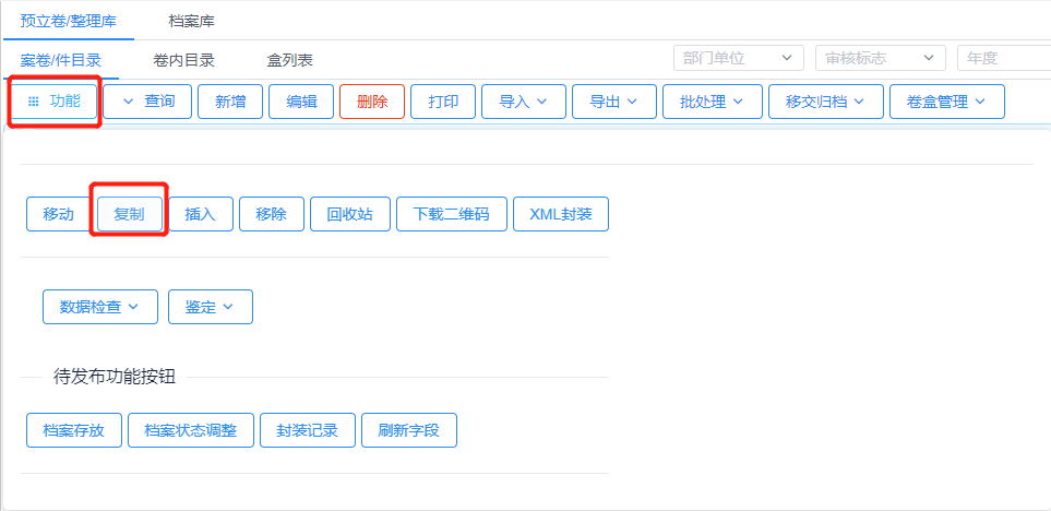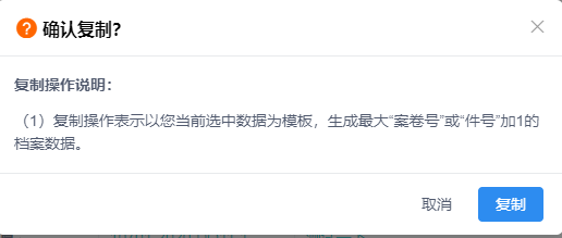 复制操作表示以当前选中数据为模板,生成最大“案卷号”或“件号”加1的档案数据,见图11-108、图11-109。