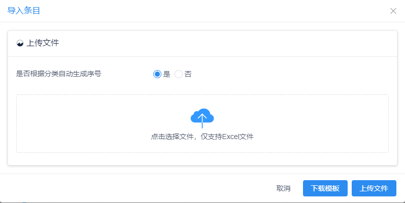 若案卷目录对应的卷内目录的大批量数据已导入,需要在原来的基础上继续补充部分卷内目录,在卷内目录目录下,点击【导入】按钮,选择【导入条目】,导入是否根据分类自动生成序号选择是,先下载模板,将数据整理至模板中,导入的卷内文件为单个sheet(对应案卷目录的字段必填,类号必填,其他字段可修改限制是否必填)。其中导入的卷内目录中,类号必填(类号:【分类名称】-【序号】)(其中分类名称部分必须精准,序号部分可填入较大数据,例如01-500),由系统自动查询当前分类名称下最大序号并+1,后台重新修改类号,并拆分生成分类名称和序号。