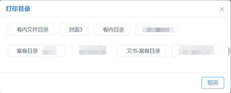 此功能主要用于打印档案的案卷目录、案卷封面、案卷移交目录、归档文件目录等。选中需要打印的案卷,并点击上方菜单上的【打印】按钮,选中需要打印的目录项即可打印(打印目录可配置)。见图11-64、图11-65: