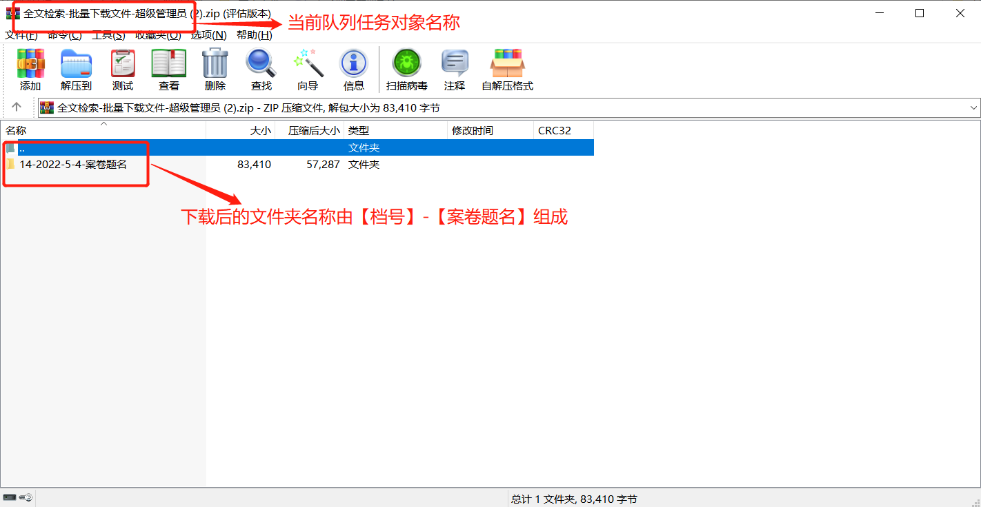 下载成功后,压缩包名称为当前队列任务的对象名称,压缩包中档案的文件夹由各个档案的【档号】-【案卷题名】组成。