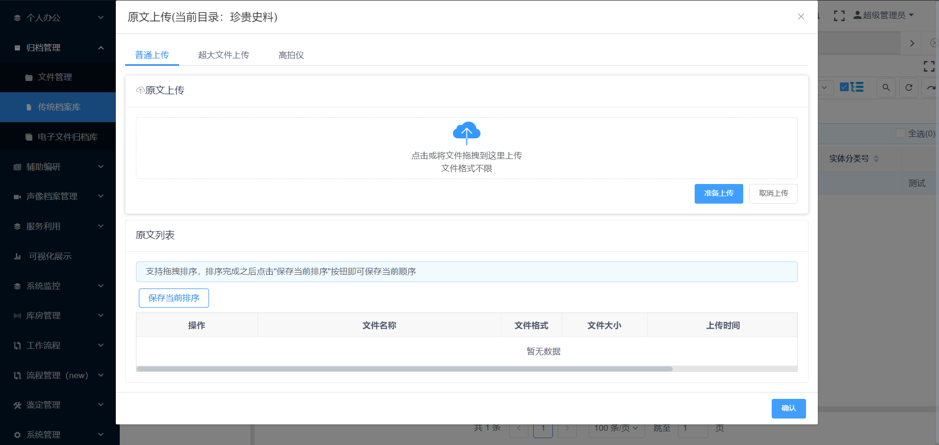 在档案管理库页面,点击指定的档案库,在对应的档号前,点击【原文上传】按钮,弹出原文上传对话框,可以上传本地文件。(50M以内的文件可使用【普通上传】,超过大小的文件可点击【超大文件上传】页签,进行大文件上传),见图11-82、图11-84