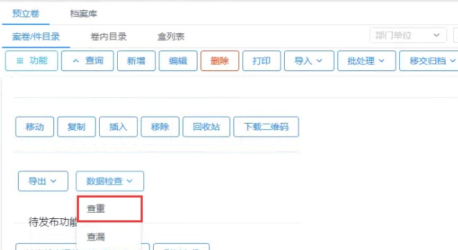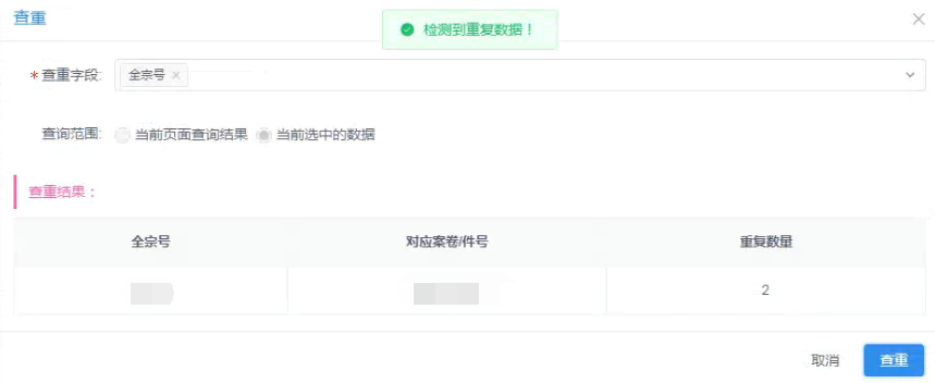 选择并勾选需要核查的档案条目,点击功能中的“数据检查”-“查重”,选择查重的字段,点击查重按钮,即可核查出选择的字段内容中是否有重复的数据,查重结果在当前页面可查看。如下图: