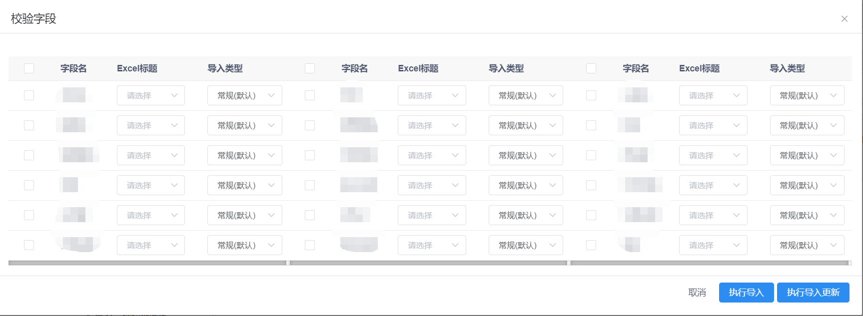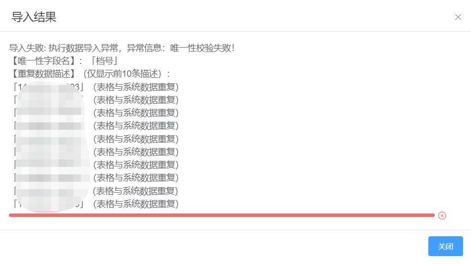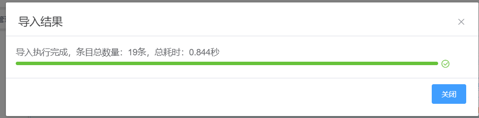 再将整理好的文件上传,点击【上传文件】按钮,进入【校验字段】页面,其中包括字段名(系统中字段名),Excel标题名(Excel中表头),导入类型(导入类型分为常规(默认)和原始值,若常规值在系统中有对应的词典数据,将转换后存入数据库中,若选择原始值,将把字段对应的值直接存入数据库中)将Excel中与系统中的字段进行匹配,确认后点击【执行导入】按钮进行导入。当进度条为绿色时,表示导入已成功,可点击【关闭】按钮关闭若导入数据在系统中已存在,会提示数据重复。见图11-51、图11-52、图11-52、图11-54、图11-55: