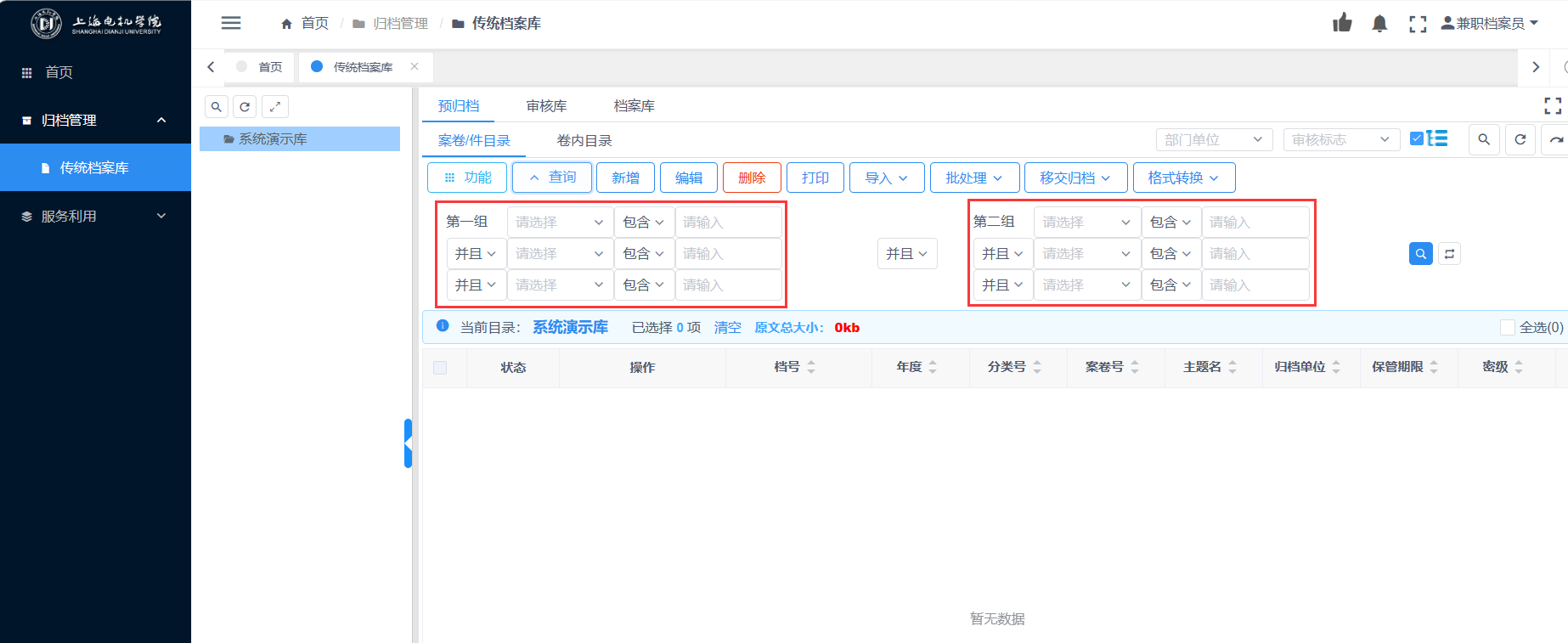同理,【非空】指的是查询左侧选择的档案字段内容不为空的档案条目(选择非空时,右侧无需再输入查询内容值);