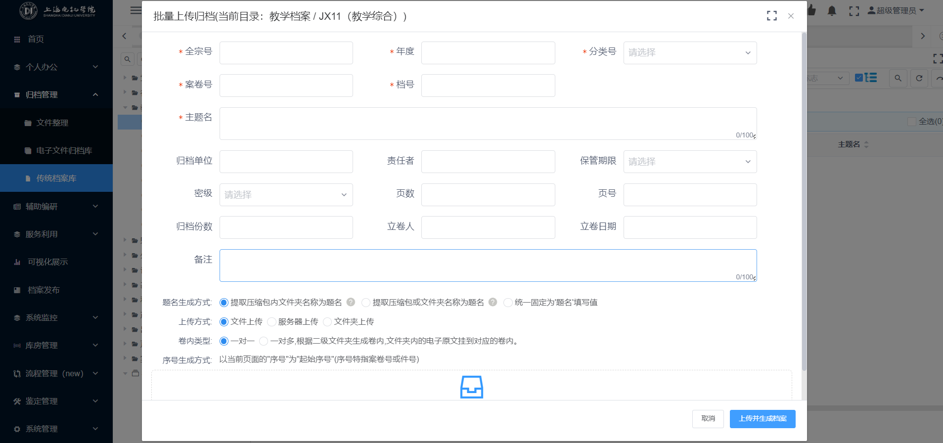 针对已经整理好的案卷可以批量上传完成立卷,此功能支持识别文件夹名做卷名文件名做卷内名称。点击【批处理】-【上传压缩包】选择整理好的压缩包确认即可。见图11-67: