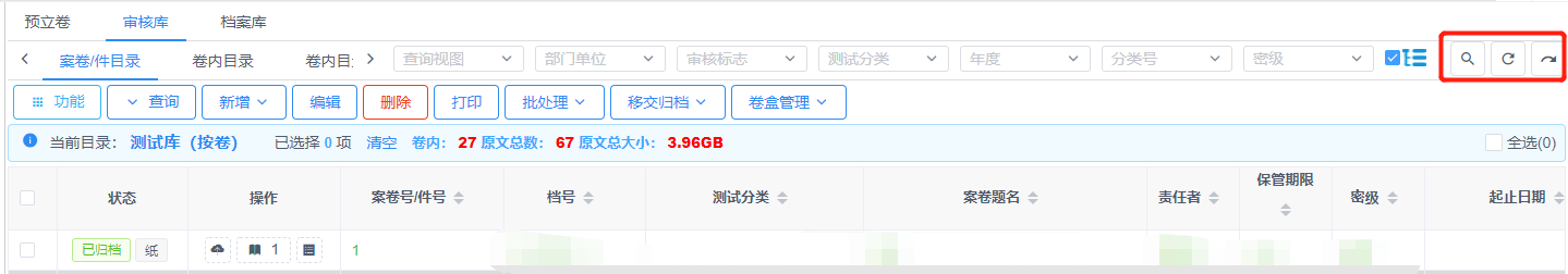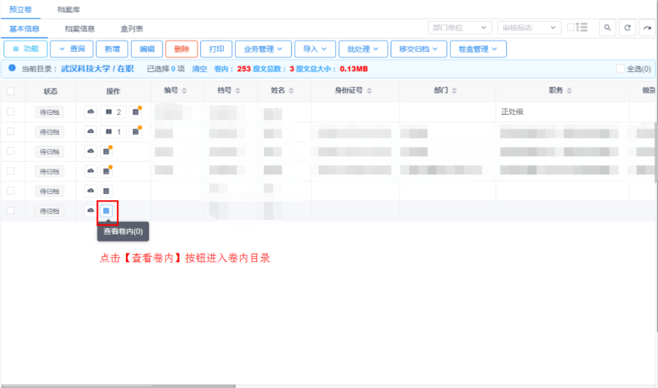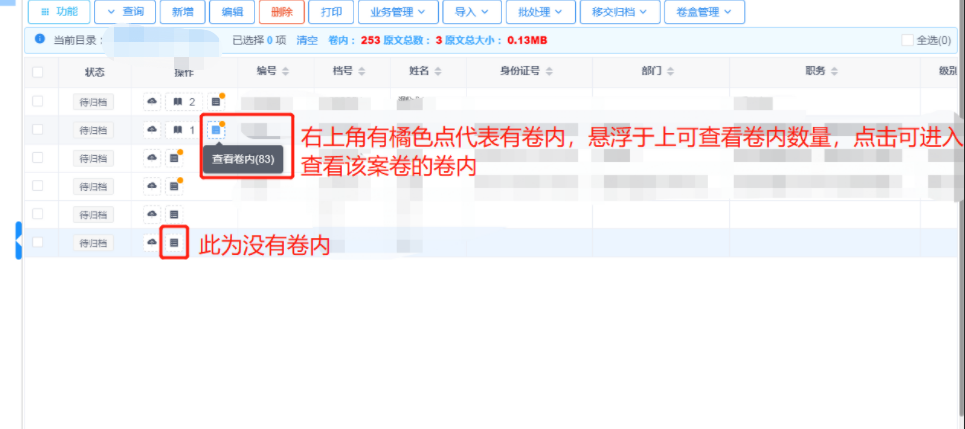 点击下图中按钮可查看案卷对应的卷内,悬浮于上可查看对应案卷的卷内数量,见图11-29。