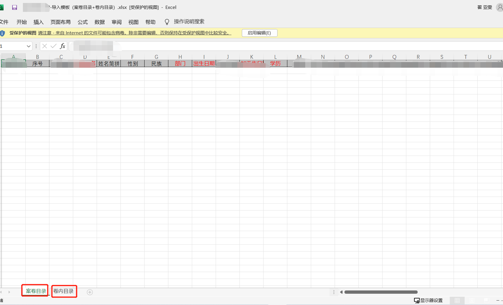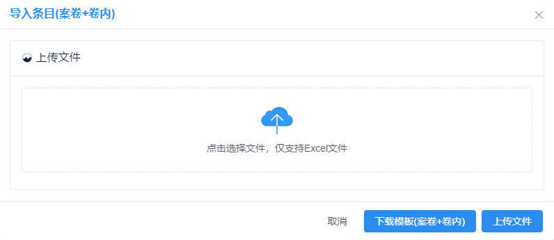 在卷内目录下,点击【导入】按钮,选择【导入条目】,先下载模板,将数据整理至模板中,导入的卷内文件为单个sheet,见图11-60、图11-61。
