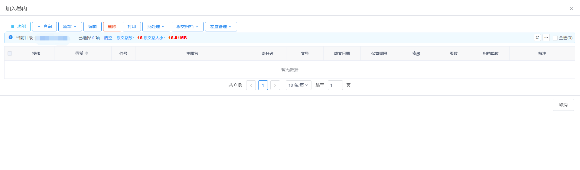当需要在案卷条目中加入卷内条目,点击对应的案卷条目所在行的操作栏中的【查看卷内】按钮,进入案卷对应的卷内目录,见图11-41。