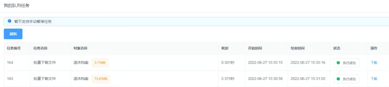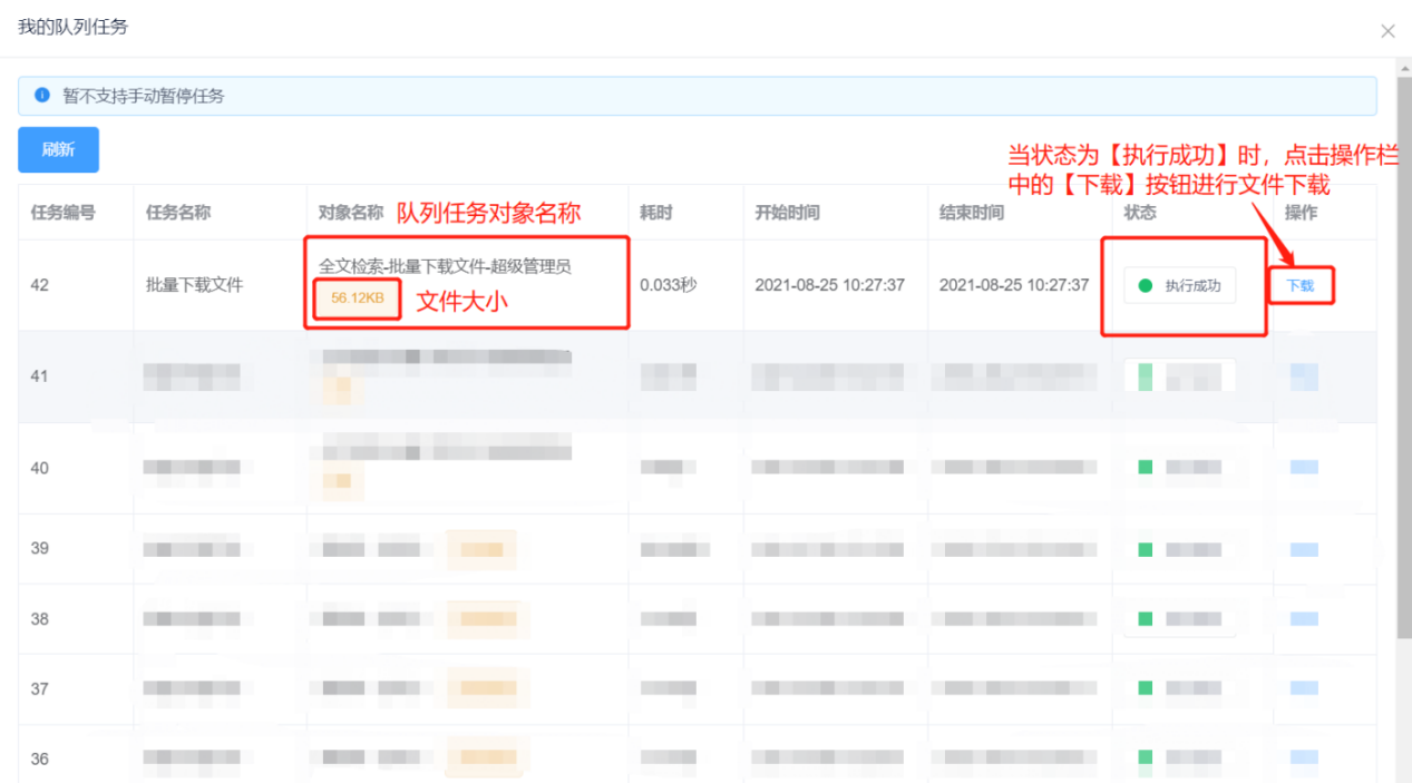 下载任务在右上角人员名称下的【队列任务】中查看,当状态为【执行成功】时,点击右侧操作栏中的【下载】按钮进行文件下载。