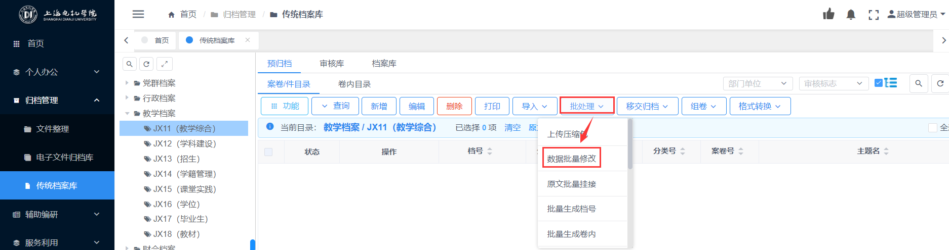 该功能用于对部门归档档案的批量修改,包括上传压缩包、数据批量修改、原文批量删除、原文批量挂接及批量下档号等。可以先批量选择对应的著录件或卷,点击【批处理】按钮选择对应的操作即可。见图11-66: