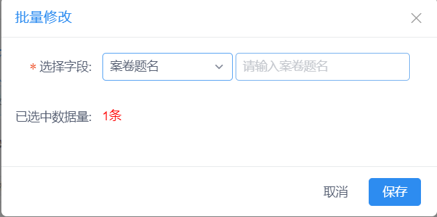 若一批数据的字段需要一起更新,则勾选这批数据后点击【批处理】-【数据批量修改】,出现批量修改表单,选择修改字段和修改后的值后,点击【保存】按钮进行保存,点击【取消】按钮取消修改,见图11-78。