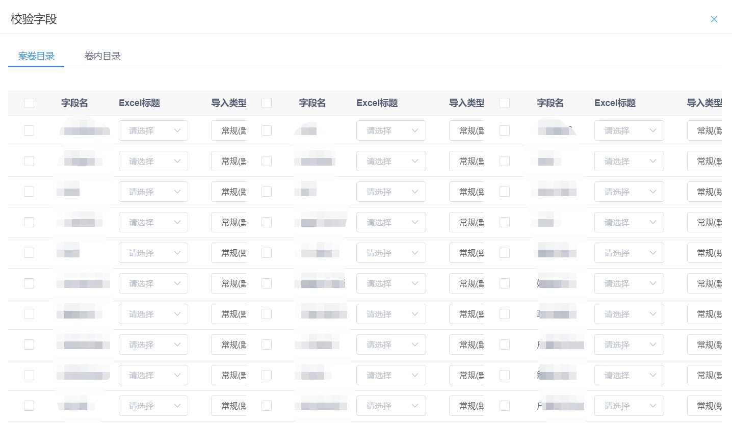 再将整理好的文件上传,点击【上传文件】按钮,进入【校验字段】页面,其中包括案卷目录和卷内目录,需要分别对应两个页签下的:字段名(系统中字段名),Excel标题名(Excel中表头),导入类型(导入类型分为常规(默认)和原始值,若常规值在系统中有对应的词典数据,将转换后存入数据库中,若选择原始值,将把字段对应的值直接存入数据库中)将Excel中与系统中的字段进行匹配,确认后点击【执行导入】按钮进行导入。当进度条为绿色时,表示导入已成功,可点击【关闭】按钮关闭若导入数据在系统中已存在,会提示数据重复(效果同上)。见图11-57、图11-58: