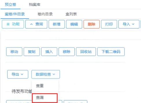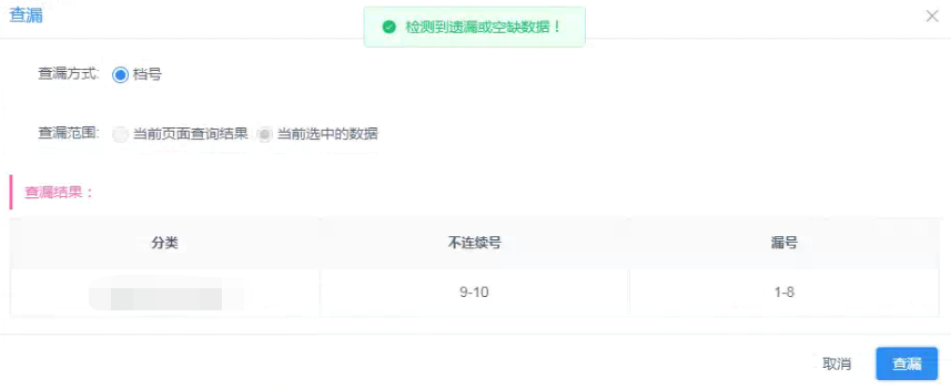选择并勾选需要核查的档案条目,点击功能中的“数据检查”-“查漏”,默认查漏的字段为档号,点击查漏按钮,即可核查出选择的条目中是否有遗漏的数据,查漏结果在当前页面可查看。如下图: