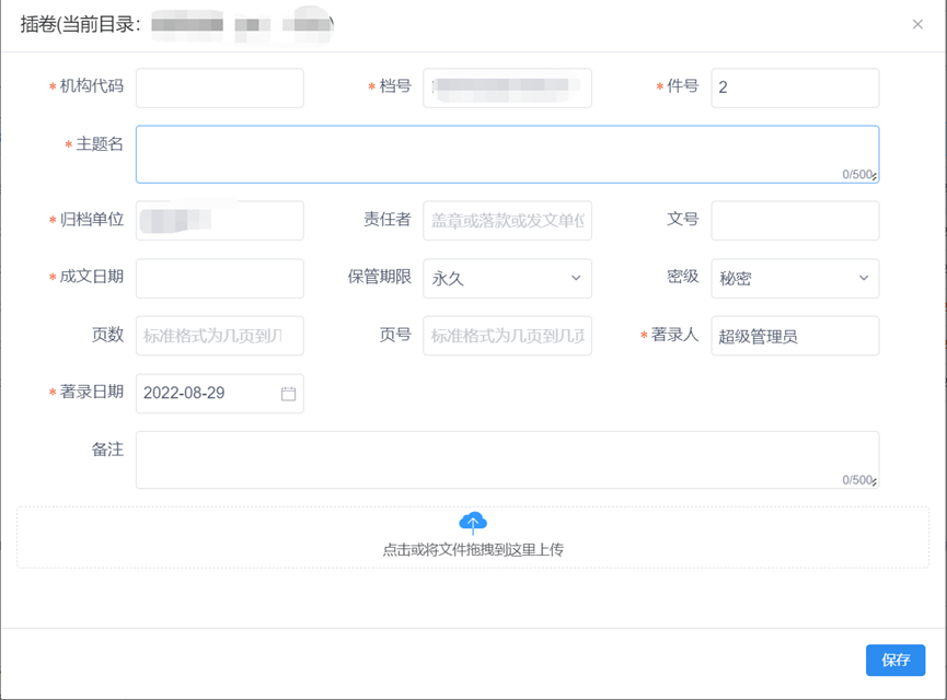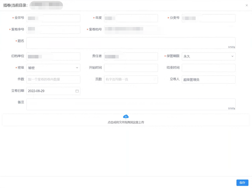 点击其中的【新增】按钮,打开新增卷内条目表单,填写对应的序号和其他卷内条目数据。点击【保存】按钮卷内保存后退出。
