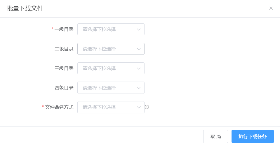 如需要下载多条案卷数据,则勾选需要下载的案卷数据,点击【批处理】-【批量下载文件】,选择需要下载的字段,选择文件命名方式,点击执行下载任务,即可在队列任务中查看下载的数据,见图11-82。