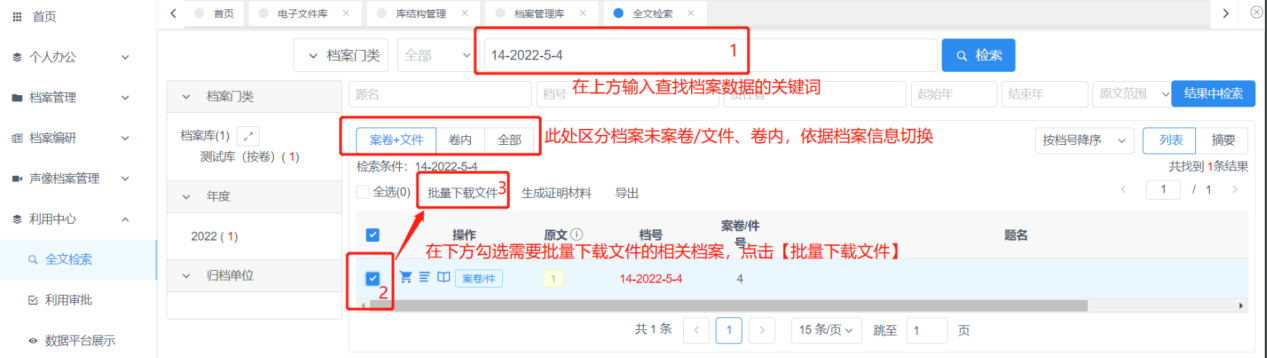 在全文检索中,可依据关键词快速查询相关档案数据,首先依据档案数据类型切换页签(案卷+文件、卷内、全部)。在下方的列表中勾选需要批量下载文件的相关档案,点击上方的【批量下载文件】按钮进行批量下载。