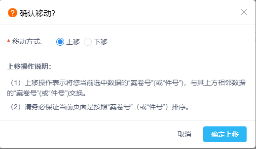单个勾选需要进行上下移动的档案条目,点击功能下的【移动】按钮,跳出移动方式选择表单,若上移,需要有对应比所选档案的“案卷号”(或“件号”)小的数据,若下移,需要有对应比所选档案的“案卷号”(或“件号”)大的数据(请务必保证当前页面是按照“案卷号”(或“件号”)排序),见图11-106、图11-107。