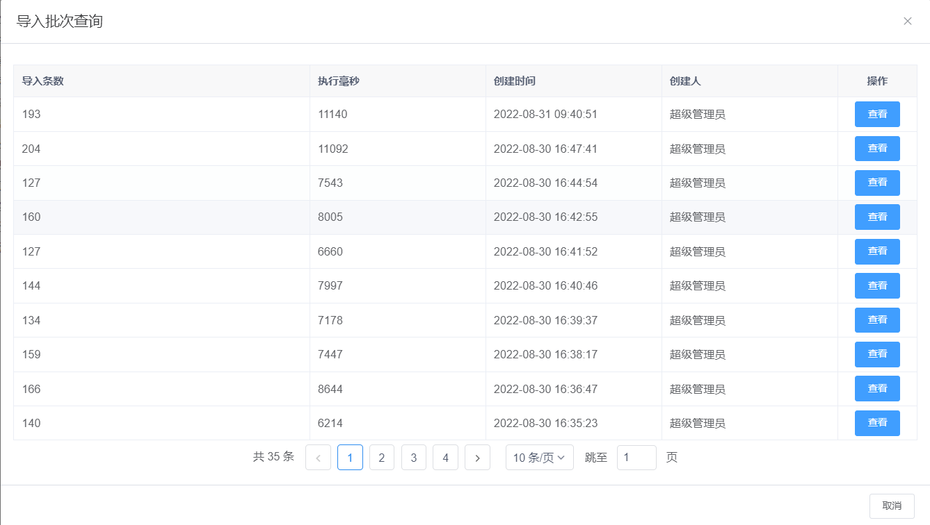 点击“导入”按钮,选择导入批次查询,即可查看导入条目的操作情况,点击查看按钮,可查看当前导入的条目信息。见图11-62: