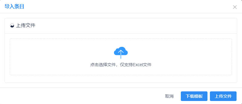 点击【导入】按钮,选择【导入条目】,先下载模板,将数据整理至模板中,导入案卷为单个sheet,见图11-50。