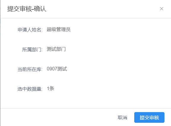 勾选状态为待归档的档案条目,点击“移交归档”-“提交审核”按钮,打开提交审核页面,选择审批人,点击提交按钮,此时档案条目的状态为待审核。如下图:
