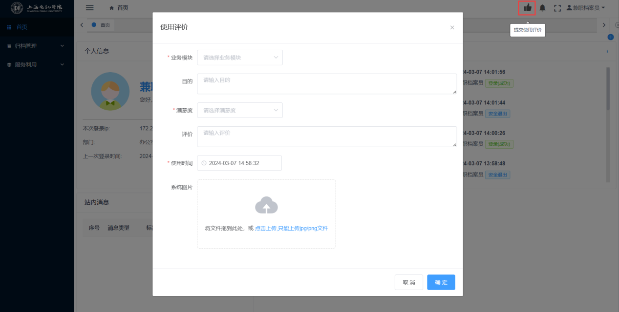 点击首页右上方的按钮,打开评价内容填写页面,填写的评价信息在评价管理中可查看。见图11-13: