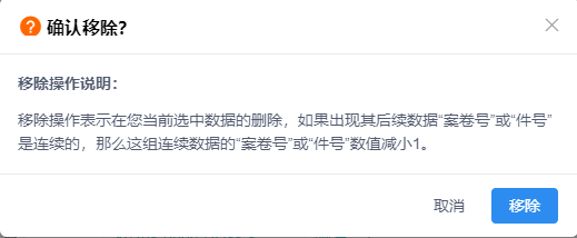 当著录的案卷目录下的内容中发现有不需要的条目,可单个勾选后点击功能中的【移除】按钮,二次确认后,若出现其后续数据“案卷号”或“件号”是连续的,那么这组连续数据的“案卷号”或“件号”数值减小1,见图11-110、图11-111。