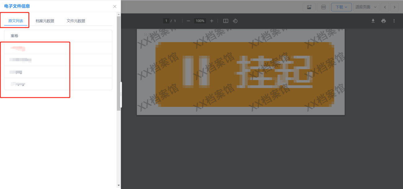 在档案管理库页面,点击指定的档案库,在对应的档号前,点击【原文预览】按钮,进入原文预览页面,见图11-85。